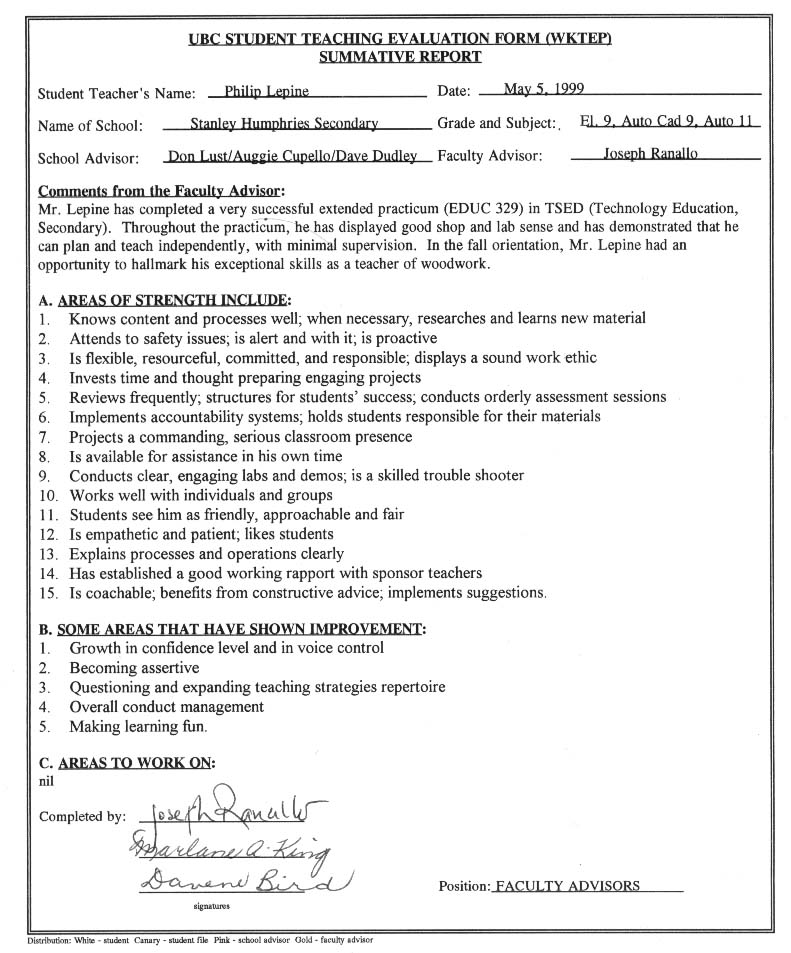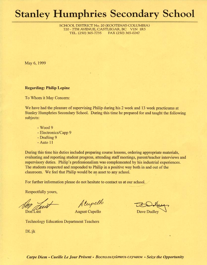 University of British Columbia Vancouver, BCBachelors of Education Completed first Semester of courses in Faculty of Education. Completed 13 week practicum at Stanley Humphries S.S. in Castlegar BC B.C.I.T. Burnaby, B CTechnology Teacher Education Completed Accelerated Level of Technology Education Program SELKIRK COLLEGE Castlegar, B CUniversity Transfer Completed courses in Fine Arts/Sciences/Mathematics MOHAWK COLLEGE Hamilton, Ont.Industrial Woodworker Completed a 10 month apprenticeship program culminating in a Industrial Woodworker Diploma